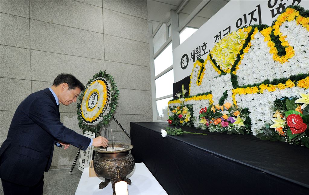 [아시아경제 노해섭 기자]윤장현 광주광역시장이 9일 오전 시청 시민 숲 내 세월호 합동분향소에서 세월호 참사 1천일을 맞아 희생자들을 추모하며 간부공무원들과 함께 헌화 분향을 하고 있다.
