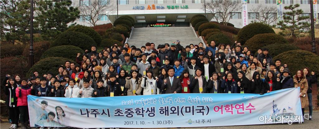 미국 헤파타 사립학교 등 3주간 현지 수업참여 및 문화체험 활동[아시아경제 문승용 기자] 나주시 초·중학생 71명이 미국 캘리포니아주 헤파타 사립학교 등에서 3주 동안 현지 수업 및 문화를 체험하는 어학연수를 위해 10일 출발했다.나주지역 초등학교 6학년 36명, 중학교 2학년 35명 등 71명은 1월 10일부터 30일까지 현지 학생들과 함께 정규 수업은 물론 현장학습, 문화체험 활동 등에 참여하게 된다.주중에는 현지 사립학교 정규 수업 및 홈스테이를 통해 미국 가정 및 학교 문화를 체험하게 되며, 주말에는 샌프란시스코에 위치한 UC버클리, 더 테크 뮤지엄, 골든게이트브릿지 등을 견학하고, LA에 있는 미국 자연사 박물관, 너츠베리 테마공원도 방문하게 된다.초등학교 아들이 연수에 참여한 학부모 김은진 씨는 “연수를 통해 영어공부를 더 열심히 하고 넓은 세상을 경험하면서 새로운 자극을 받는 계기가 되길 기대한다”며 “아이들을 멀리 보내기 쉽지 않은데 수년간의 연수경험을 바탕으로 공무원들과 교사들이 함께 인솔하고 가기 때문에 안심이 된다”며 감사의 뜻을 전했다.어학연수에 참가한 학생들은 지난 12월초 선발시험을 거쳐 확정되었으며, 시에서는 ▲어려운 가정 학생 전액 경비 지원 ▲일반 학생 경비 일부 지원 ▲전액 자부담 학생 1명 추가 선발 등 다수보편적 교육복지 확산에 노력하고 있다.강인규 시장은 이날 출국 환송식에서 “미국 어학연수를 통해 국제적 경험을 쌓고 안목을 넓혀 미래 나주시 발전에 기여할 수 있는 글로벌 인재로 성장해 주길 바란다”고 격려하면서 안전하고 건강하게 귀국할 것을 당부했다.한편 시는 다수보편적 교육복지 확산을 위해 전년 겨울방학 대비 어학연수 참여 학생을 30명에서 71명으로 늘렸으며, 지난해 7월 강인규 시장이 방문한 미국 메릴랜드 주 하워드카운티와의 교육분야 교류 확대를 위해 올해 여름방학 어학연수를 준비하고 있다.문승용 기자 msynews@<ⓒ세계를 보는 창 경제를 보는 눈, 아시아경제(www.asiae.co.kr) 무단전재 배포금지>