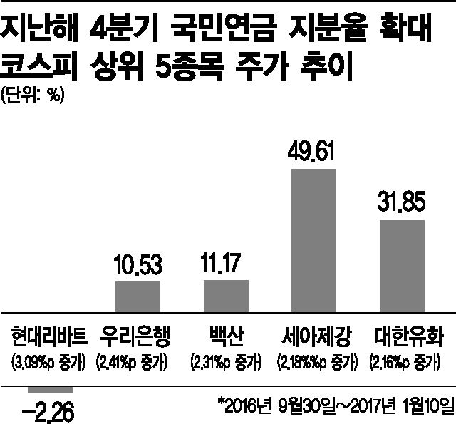 지분률 높인 5종목 중 4종목↑주식 판 종목은 내려[아시아경제 권성회 기자] 지난해 4분기 국민연금이 주식을 많이 사들인 종목은 오르고, 반대로 주식을 많이 판 종목은 주가가 내린 것으로 조사됐다. 11일 금융감독원 및 한국거래소에 따르면 국민연금이 지분율을 가장 많이 높인 코스피 상장사 5종목 가운데 4종목이 지난해 9월30일 기준 1월10일 현재까지 주가가 올랐다. 국민연금의 지분율이 2.41%포인트 늘어난 우리은행은 이 기간 동안 1만1400원에서 1만2600원까지 올라 11.17%의 상승률을 기록했다. 같은 기간 주가가 급등한 종목도 있었다. 국민연금의 지분율이 지난해 3분기 6.69%에서 지난해 4분기 8.87%로 2.18%포인트 오른 세아제강은 6만3900원에서 9만5600원까지 치솟아 49.61%의 상승률을 기록했다. 국민연금 지분율이 7.01%에서 9.17%로 2.16%포인트 늘어난 대한유화 역시 같은 기간 21만3500원에서 28만1500원으로 31.85%의 상승률을 보였다. 반면 현대리바트는 국민연금 지분율이 3.09%포인트 늘어나 최고치를 보였으나 주가는 2.26% 하락했다. 국민연금이 지분을 많이 판 종목들은 대부분 주가가 내렸다. 국민연금이 지분율을 가장 많이 낮춘 코스피 5종목 중에서 같은 기간 동안 주가가 오른 종목은 한 곳뿐이다. 국민연금 지분율이 지난해 3분기 7.70%에서 지난해 4분기 4.64%로 줄어든 아세아시멘트만 주가가 1.36% 증가했다. 국민연금 지분율이 가장 많이 감소한 대한해운은 같은 기간 주가가 2만1000원에서 1만6800원으로 정확히 20%가 빠졌다. 대한해운에 대한 국민연금 지분율은 9.11%에서 6.03%로 3.08%포인트 줄어들었다. 이밖에도 동아쏘시오홀딩스는 국민연금 지분율이 2.89%포인트 내리면서 주가도 17.13% 빠졌고, 한진칼도 국민연금 지분율이 2.38% 낮아지면서 주가 역시 18.18% 하락했다. 국민연금 지분율이 2.08%포인트 내린 제주항공은 주가가 3만2400원에서 2만4400원으로 떨어져 24.69%의 하락률을 기록했다. 이런 모습은 코스닥 상장사들에게서도 비슷하게 나타났다. 국민연금 지분율이 1.24%포인트 늘어난 디엔에프는 13.84%의 주가 상승률을 기록했고, 국민연금 지분율이 1.03%포인트 상승한 덕산하이메탈 역시 주가가 2.77% 올랐다. 반면 국민연금 지분율이 2.20%포인트 줄어든 원익머트리얼즈 주가는 7.71% 하락했고, 국민연금 지분율이 2.14%포인트 감소한 아스트 역시 같은 기간 6.04%의 주가 하락률을 보였다.권성회 기자 street@asiae.co.kr<ⓒ세계를 보는 창 경제를 보는 눈, 아시아경제(www.asiae.co.kr) 무단전재 배포금지>