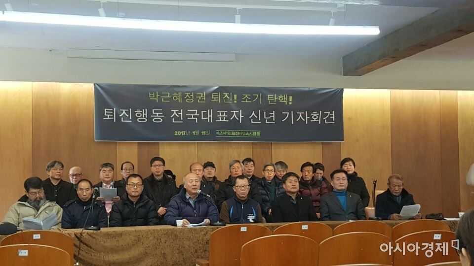 박근혜정권퇴진 비상국민행동이 11일 오후 1시 서울 정동 프란치스코회관에서 전국대표자 신년 기자회견을 열고 정원스님에 대한 장례절차 등을 설명하고 있다.