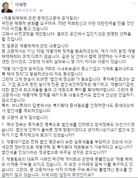 [아시아경제 송윤정 인턴기자] 이재명 성남시장이 문재인 전 대표에게 공개적 질의를 하며 공격적 행보를 이어가고 있다.13일 이 시장은 자신의 페이스북에 "비전경쟁 1. 재벌체제 해체 관련 문재인 전 대표님께 공개질의"라는 글을 올렸다.글에서 이 시장은 "문 대표는 지난 10일 재벌개혁 정책을 패키지로 내놓으면서 법인세 인상은 언급하지 않았다"며 "역대 정부는 투자촉진 명목으로 법인세를 인하했고 참여정부도 마찬가지였다. 법인세 인하가 올바른 정책 방향이었다고 생각하시는지, 법인세 인하가 기업 투자제고에 효과가 있었는가?"라고 반문했다.또 이 시장은 "재벌대기업은 전체 법인 평균보다 낮은 실효세율을 부담하고 있는데 비과세감면 정비만으로 재벌개혁 및 복지확대 재원확보가 가능하다고 보는가? 법인세율 인상이라는 정공법으로 바꾸실 생각은 없는가?"라고 물었다.마지막으로 그는 "재벌횡포의 대표적 사례인 박근혜 게이트와 관련해 촛불민심은 '재벌 해체와 이재용 구속'을 외치고 있다. 저 또한 수차례에 걸쳐 이를 촉구하고 있다. 그런데, 문 고문께서는 아직 이재용 구속 촉구와 불법재산 환수를 언급하지 않고 있다. 이에 대한 입장이 무엇인가"라고 거듭 입장 표명을 요구했다.한편 이 질의로 최근 주춤한 이재명 시장의 지지율 상승세가 다시 올라갈 수 있을 지 네티즌들의 관심이 모아지고 있다.송윤정 인턴기자 singasong@asiae.co.kr<ⓒ세계를 보는 창 경제를 보는 눈, 아시아경제(www.asiae.co.kr) 무단전재 배포금지>