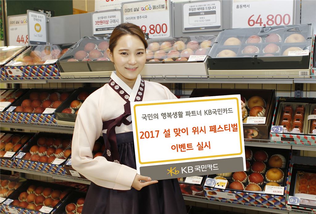 [아시아경제 김민영 기자]KB국민카드가 '설 맞이 위시 페스티벌' 이벤트를 실시한다고 15일 밝혔다.우선 설 관련 업종을 이용하는 고객에게 경품을 제공한다. 오는 16일부터 이달 말까지 행사에 응모하고 KB국민카드(기업카드, 선불카드 제외)로 특정 업종에서 이용한 금액이 30만원 이상이면 추첨을 통해 총 2017명에게 다양한 경품을 제공한다.16일부터 오는 23일까지 백화점, 대형마트, 농수축협직판장 업종에서 이용한 금액이 30만원 이상이면 캐시백 100만원(10명), 장보기 업종 이용금액 캐시백 최대 30만원(50명), 장보기 업종 이용금액 캐시백 최대 10만원(100명) 등 총 160명에게 경품을 제공한다.24일부터 이달 말일까지 외식업종에서 이용한 금액이 30만원 이상이면 300만원 상당의 바디프랜드 안마의자(1명), 정관장 모바일 상품권 20만원(30명), 외식비 지원금 10만원(50명), 파리바게뜨 모바일 교환권 5000원(1776명) 등 총 1857명에게 경품을 제공한다.선물세트 구매 시 상품권 증정과 최대 30% 할인행사도 진행한다. 이마트, 홈플러스, 롯데마트에서 10만원 이상 설 선물세트를 구입하면 결제 금액에 따라 최대 50만원을 상품권으로 증정하거나 행사 대상 선물세트 구매 시 최대 30% 할인을 제공한다.행사 기간은 이마트와 롯데마트는 오는 28일까지고, 홈플러스는 오는 16일부터 30일까지다.무이자 할부 혜택도 제공된다. 오는 3월31일까지 KB국민카드(기업카드, KB국민 비씨카드, KB국민 선불카드 제외)로 백화점, 항공사 등 59개 생활편의 업종에서 결제하면 업종에 따라 2~6개월까지 무이자 할부 혜택이 제공된다.김민영 기자 mykim@asiae.co.kr<ⓒ세계를 보는 창 경제를 보는 눈, 아시아경제(www.asiae.co.kr) 무단전재 배포금지>