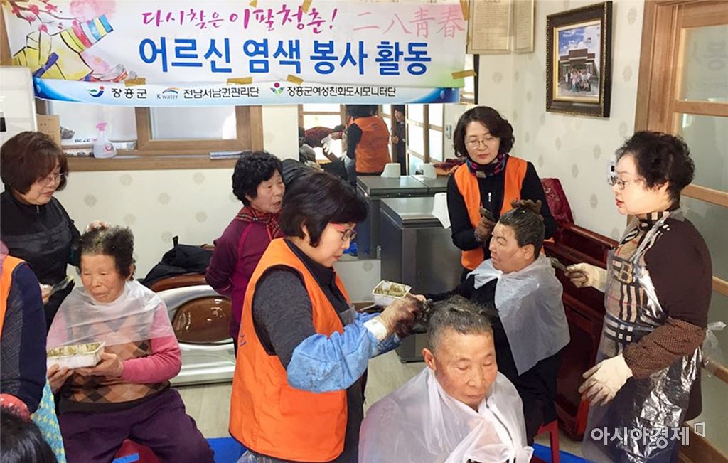 "여성친화도시모니터단과 설맞이 어르신 공경의 날 행사 운영""독거노인생활관리사 동행 지역 독거노인 직접 살펴"[아시아경제 노해섭 기자]장흥군은 여성친화도시모니터단과 함께 지난 15일과 16일 양일간에 걸쳐 설맞이 어르신 공경의 날 행사를 운영했다고 밝혔다.경로당 7곳을 순회하며 개최된 이번 행사에서는 설 명절을 앞두고 염색과 머리손질 봉사가 이뤄졌다.15일 장흥읍 행원마을과 부산면 내동마을, 안곡마을을 시작으로, 16일에는 장흥읍 향양마을, 장평면 두봉마을·녹양마을, 부산면 효자마을 순으로 진행됐다.이번 설 명절 염색봉사에는 군 독거노인생활관리사가 참여하여 지역 독거 어르신을 직접 살폈다.이날 한 어르신은 “설이 다가오는데 단정하게 염색과 머리손질을 해줘 무척 고맙다”며 “명절에 자식들을 볼 생각에 벌써 설렌다”고 말했다.여성친화도시모니터단 채은아 단장은 “해맑게 웃으며 한결 고와진 모습에 감사함을 전하는 어르신들 덕에 큰 보람을 느낀다”며 “새해에는 더욱 따뜻한 봉사로 이웃에게 희망을 전하겠다”고 말했다.한편, 여성친화모니터단은 한국수자원공사 전남서남권관리단의 후원으로 매월 경로당을 방문해 염색, 목욕, 점심 제공 등의 봉사활동을 펼치고 있다.노해섭 기자 nogary@<ⓒ세계를 보는 창 경제를 보는 눈, 아시아경제(www.asiae.co.kr) 무단전재 배포금지>