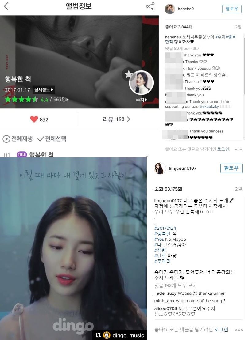 [아시아경제 김윤주 인턴기자] 배우 장희령과 임주은이 절친 수지의 신곡 ‘행복한 척’ 홍보에 나섰다.장희령은 17일 자신의 인스타그램에 “노래 너무 좋아 수지. 행복하자♥”라는 글과 스트리밍 화면을 캡처한 사진을 올려 수지를 응원했다. 임주은도 17일 인스타그램에 “너무 좋은 수지의 노래. 자정에 선 공개되는 곡부터 시작해서 우리 모두 무한 반복해요”라며 “울다가 웃다가. 흥얼흥얼. 너무 공감되는 수지 노래들”이라는 글과 동영상을 공유했다.장희령과 임주은은 앞서 KBS2 드라마 ‘함부로 애틋하게’에서 수지와 호흡을 맞춘 바 있다. 당시 극중 수지는 주인공 노을 역으로, 장희령과 임주은은 각각 장만옥, 윤정은 역으로 분했다. 한편 18일 공개된 리얼리티 ‘오프 더 레코드, 수지’에서 자신의 노래가 1위로 차트에 진입한 것을 확인한 수지는 절친 장희령, 임주은, 김민영을 집으로 초대해 축하 파티를 벌였다. 김윤주 인턴기자 joo0416@asiae.co.kr<ⓒ세계를 보는 창 경제를 보는 눈, 아시아경제(www.asiae.co.kr) 무단전재 배포금지>