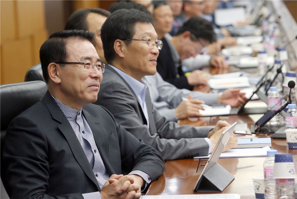 지난해 개최된 신한은행 임원·본부장 워크숍에서 조용병(맨 왼쪽) 신한은행장이 발표를 듣고 있다. (사진 : 아시아경제DB)
