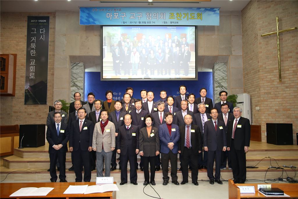박홍섭 마포구청장(앞줄 왼쪽 네번째)과 차경애 전 YWCA연합회장(앞줄 왼쪽 다섯번째), 김경한 마포부구청장(앞줄 오른쪽 네번째), 동막교회 곽재욱 목사(앞줄 왼쪽 두번째), 한일용 마포구의회 의장(앞줄 왼쪽 두번째) 및 참석한 관계자들과 기념사진을 찍고 있다.