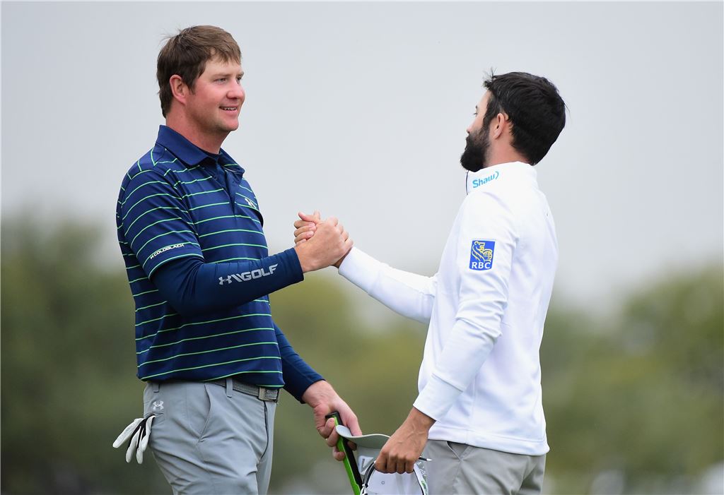 허드슨 스와포드(왼쪽)가 커리어빌더챌린지 최종일 우승 확정 직후 '미스터 59' 애덤 해드윈과 악수를 나누고 있다.