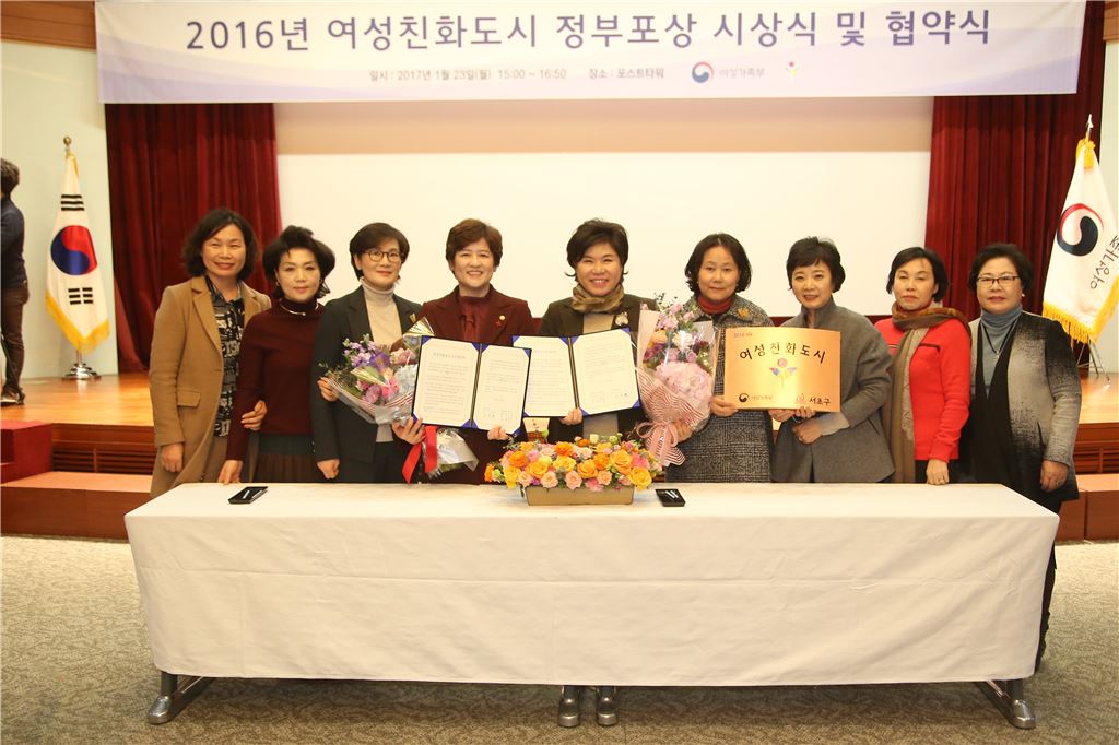 [아시아경제 박종일 기자] 여성친화도시로 신규 지정된 서초구(구청장 조은희)가 23일 여성가족부와 여성친화도시 조성 협약을 체결했다. 구는 이번 협약 체결로 여성가족부와 상호협력해 주민의 삶의 질 향상을 위한 아버지센터 운영, 나비코칭사업 등 생활밀착형 양성평등정책을 구현해 나갈 방침이다.박종일 기자 dream@asiae.co.kr<ⓒ세계를 보는 창 경제를 보는 눈, 아시아경제(www.asiae.co.kr) 무단전재 배포금지>