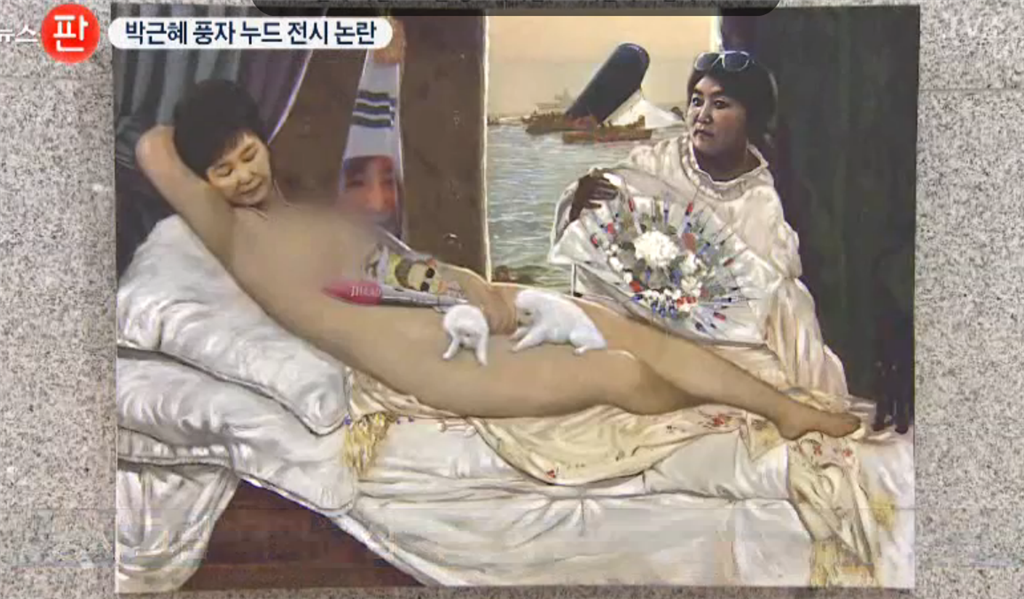 [아시아경제 최지혜 인턴기자] 표창원 더불어민주당 의원이 기획한 시국비판 풍자 전시회가 국회에서 열리고 있는 가운데, 박근혜 대통령 나체를 표현한 그림이 논란을 빚고 있다. 지난 20일부터 오는 31일까지 국회의원 회관1층 로비에서 표창원 의원과 '표현의 자유를 향한 예술가들의 풍자 연대'가 함께 기획한 '곧, BYE! 전(展)'이 열리고 있다. 문제의 그림은 에두아르 마네의 '올랭피아'를 패러디한 '더러운 잠'이라는 제목의 그림이다. 이 그림 속에는 박 대통령이 나체 상태로 자고 있으며 뒤 배경에는 세월호가 침몰하고 있다. 박 대통령의 복부에는 박정희 전 대통령 초상 사진과 '사드(THAAD)'라고 적힌 미사일이 그려져 있으며, 옆에는 최순실씨가 주사기 다발을 들고 있다. 최씨의 얼굴은 태극기 그림에도 등장한다. 왼쪽 사진은 에두아르 마네의 '올랭피아' (1863년 작). 국회의원 회관 로비에 이 작품을 패러디해 박근혜 대통령을 나신으로 처리한 그림을 전시해 물의를 빚고 있다.새누리당은 이 그림을 두고 "풍자를 가장한 인격모독과 질 낮은 성희롱이 난무하고 있다"며 강력 반발하고 나섰다. 김정재 새누리당 원내대변인은 "예술인들의 건전한 시국비판은 존중받아 마땅하지만 정도를 넘어선 행위는 분노를 부추기는 선동이고 표현의 자유를 빙자한 인격살인 행위와 다를 바 없다"며 "전시회 내용도 문제지만 표 의원이 이 전시회를 기획했다는 점이 큰 논란이 되고 있다"고 비난했다. 해당 그림을 접한 네티즌들은 "진심 배신감 들어 프로파일러라며 많은 여자들이 혐오 속에 모르는 남자들한테 죽어간 거 많이 봐 왔을거 아냐...그런데도 어떻게(토**)", "잘잘못을 떠나 인간에 대한 최소한의 예의를 지켜라(박**)", "박근혜가 여자로 잘못한게 아니라 대통령으로써 잘못한 거 이게 그렇게 어렵습니까(네***)"등의 반응을 보이고 있다.<center><div class="slide_frame"><input type="hidden" id="slideIframeId" value="2016120911054189284A">