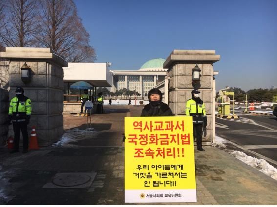 [아시아경제 박종일 기자] 서울시의회 교육위원회가 국정 역사교과서 관련 국정화 금지법 촉구 및 국정교과서 철회를 요구하는 릴레이 시위에 돌입했다.서울시의회 문형주 의원(교육위원회, 서대문3)은 지난 24일 국회 앞에서 ‘역사교과서 국정화 금지법 조속처리!! 우리 아이들에게 거짓을 가르쳐서는 안 됩니다!!’는 피켓을 들고 1인 시위를 했다.교육부가 공개한 국정교과서 현장검토본은 현대사 부분에서 독재정권 미화, 친일파 행적 축소 등 편향된 시각으로 역사를 왜곡하며 올바른 역사교육에서 크게 벗어난다며 철폐하라는 재야의 움직임이 갈수록 거세지고 있다.