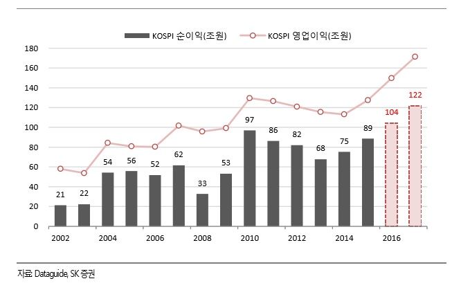 [아시아경제 조강욱 기자] 지난해 기업순이익이 100조원에 육박했을 것이란 전망이 제기된다. 특히 올해는 120조원을 넘어설 것이란 기대감이 커지고 있다.SK증권은 최근 6개월 전략 보고서에서 "지난해 이미 코스피 순이익이 100조원에 육박했을 것으로 추정된다"면서 "올해에는 코스피 순이익이 120~130조원까지 늘어날 것으로 기대하고 있다"고 밝혔다. 지난 2010년 차화정랠리의 힘으로 90조원을 넘었던 코스피 순이익은 2013년 60조원 대까지 하락했다. 당시 코스피 순이익을 억눌렀던 이슈로는 ▲미국의 긴축(테이퍼 링)이슈 ▲일본의 아베노믹스 ▲원자재가격 하락 ▲건설/조선 등의 저가수주 등이 있었다. 보고서는 하지만 최근 들어서는 상황이 많이 바뀌고 있다고 지적했다. 과거 대규모 손실을 기록했던 조선/건설 등 산업재가 적자에서 벗어났고 한때 적자까지도 몰렸던 에너지/화학은 마진개선으로 사상최대 실적을 넘나들고 있다는 설명이다. 또 한국 증시의 한 축을 담당하는 소재 /산업재가 살아나는 와중에, 시총에서 가장 큰 비중을 차지하고 있는 IT업종은 눈부신 이익 성장률을 나타내고 있는 상황이다.보고서는 올해 예상되는 코스피 순이익 증가액이 약 18조원이라고 봤다. 이중 절반 이상인 64%(11.3조원)가 IT의 이익개선에 의한 것이고 그 중에서도 삼성전자(+7.4조원)와 SK 하이닉스(+1.7조원)의 순이익 증가가 대부분을 차지한다는 설명이다. 다음으로 자동차업종이 약 1조원 정도 증가할 것으로 전망했다. 결론적으로 올해 이익 개선의 대부분은 IT에서 나온다고 내다봤다. 다만 보고서는 그동안 연초 추정치가 항상 과대 전망돼 왔다는 점이 우려된다고 지적했다. 그동안 패턴을 보면, 연초에는 이익 전망치가 높았다가, 이후 크게 하향 조정되는 패턴이 반복되곤 했기 때문이다. 하지만 보고서는 이번에는 이전과는 달리 최소한 1분기 중에는 추정 치가 오히려 더 상향조정 될 가능성이 있다고 봤다. 반도체 업종을 중심으로 IT 기업들의 이익 전망치가 여전히 빠른 속도로 상향 조정되고 있기 때문이다. 보고서는 2017년 삼성전자 영업이익을 45조원 규모로 추정하고 있으며, SK하이닉스 역시 7조원 달성이 가능할 것으로 전망했다. 영업이익 컨센서스 추정치 평균인 삼성전자(38조원), SK 하이닉스(5.5조원) 보다 약 9조원 가까이 많은 것이다. 이에 따라 코스피 순이익 120조원이 아주 터무니 없지는 않다는 설명이다.박형우 SK증권 연구원은 "하반기로 넘어가면서 트럼프의 환율조작국 지정으로 외환시장이 크게 변동할 가능성이 있고, 증설에 따른 반도체 가격 하락 가능성이 있기 때문에 다시 한번 체크가 필요할 것"이라면서도 "그러나 당분간은 거침없는 추정치 상향이 이어질 것으로 보인다"고 말했다.조강욱 기자 jomarok@asiae.co.kr<ⓒ세계를 보는 창 경제를 보는 눈, 아시아경제(www.asiae.co.kr) 무단전재 배포금지>