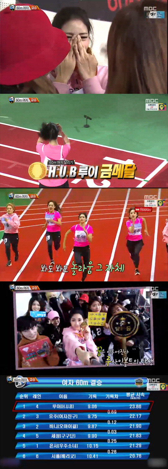 [아시아경제 송윤정 인턴기자] '아육대' 걸그룹계 우사인볼트가 탄생했다.30일 방송된 MBC '설특집 2017 아이돌스타 육상 양궁 리듬체조 에어로빅 선수권대회(이하 '아육대')' 60m 여자 달리기 결승전에서는 H.U.B 루이가 압도적인 기록으로 금메달을 목에 걸었다.'아육대' 공식 체육돌 여자친구 유주를 비롯해 오마이걸 비니, 구구단 세정과 결승에 오른 루이는 스타트부터 남달랐다.남다른 기럭지를 자랑하며 순식간에 결승선에 다다른 루이는 9.06이라는 어마어마한 기록을 남겼다.역대급 기록 탄생에 참가자들은 경악하며 입을 다물지 못했다.방송은 본 시청자들은 "루이 도핑테스트 해봐야 됨" "루이 얘는 달리는게 차원이 다르던데" "아이돌수준이 아니네요. 보폭만 보면 선수급" "와 겁나 잘달리네 ㄷㄷ" 등 놀랍다는 반응을 보였다.한편 이날 남자 단거리 결승에서는 지난 대회에 이어 스누퍼 우성이 1위를 기록했다.송윤정 인턴기자 singasong@asiae.co.kr<ⓒ세계를 보는 창 경제를 보는 눈, 아시아경제(www.asiae.co.kr) 무단전재 배포금지>