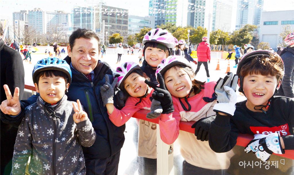 윤장현 광주광역시장이 31일 오후 광주시청 야외스케이트장을 찾은 어린이들과 즐거운 시간을 보내고 있다. 이날 폐장한 야외스케이트장과 얼음썰매장은 지난해 12월 17일 개장해 46일간 총 7만5000여 명의 시민들이 이용하며 겨울 명소로 자리 잡았다./광주광역시 제공
