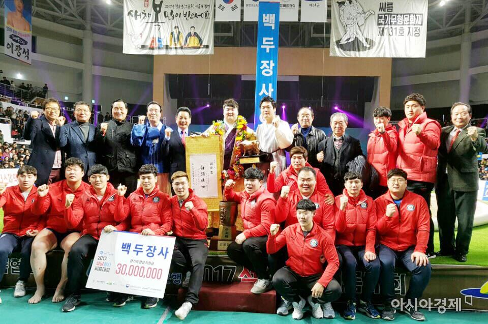 "2017설날장사씨름대회 백두장사(이슬기), 한라장사(최성환) 등극""탁월한 경기력으로 두 체급 제패, 영암군과 달마지쌀 전국 홍보" [아시아경제 노해섭 기자]영암군민속씨름단(구단주 전동평)이 창단 원년 첫 출전한 2017설날장사씨름대회에서 두 체급을 제패하며 민속씨름의 절대 강자로 우뚝 섰다.군에 따르면 지난 1월 24일부터 6일간 충남 예산에서 열린 2017설날장사씨름대회에서 영암군민속씨름단이 백두장사(이슬기 선수), 한라장사(최성환 선수), 백두급 1품(정창조 선수), 금강급 1품(최정만 선수), 한라급 4품(박병훈 선수)의 성적을 거두며 모래판을 호령하는 ‘명문 씨름단’의 기틀을 다졌다고 밝혔다.특히, 체급별 8강에 진출한 선수들은 탁월한 실력으로 화끈한 경기력을 선보이며 영암군민과 16만 향우를 비롯해 전국의 시청자를 매료시켰으며, kbs 1tv 생중계를 통해 씨름 유니폼에 새겨진 ‘달마지쌀’을 전국에 알리게 됐다.영암군민속씨름단에 첫 우승 타이틀을 선사한 한라장사 최성환 선수는 한라급(110kg 이하) 16강부터 준결승까지 2-0 완승으로 결승에 진출했고, 대망의 결승전에서는 박정의 선수(정읍시청)에게 첫판을 내주고도 내리 세 판을 따내는 역전 드라마를 연출하며 꽃가마에 올라탔다.이어 대회 마지막날 이슬기 선수는 16강에서 ‘명절장사’장성복(양평군청)을, 8강에서 ‘백두장사 6회 우승자’정경진(울산동구청)을, 준결승에서 '2016추석 백두장사 손명호(의성군청)를 물리치며 결승에 진출했고, 영암군민속씨름단 소속 선수(정창조)끼리 맞대결(3-1 승리)로 설날 대회 백미를 장식하며 백두장사에 올랐다.이번 대회 2체급 석권으로 명장 반열에 올라 선 김기태 감독은 “변화된 환경에서 묵묵히 고된 훈련을 이겨내고 성과를 내 준 선수들에게 고맙다”며 소감을 밝힌 뒤 "대회 기간 내내 관심과 성원을 보내주신 전동평 군수님을 비롯한 영암군민, 향우들께 감사드린다"고 말했다.한편, 최근 씨름이 국가무형문화재 제131호로 지정되고, 문화재청과 통합씨름협회에서는 유네스코 인류무형문화유산 등재를 추진하는 등 과거의 인기를 재현하고 있으며, 설날대회에서 신흥강호로 떠오른 영암군 민속씨름단의 향후 행보에 대한 귀추가 주목받고 있다. 노해섭 기자 nogary@<ⓒ세계를 보는 창 경제를 보는 눈, 아시아경제(www.asiae.co.kr) 무단전재 배포금지>