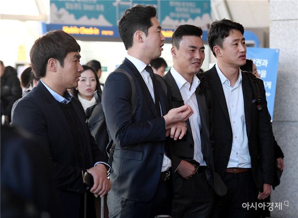 [인천공항=아시아경제 김현민 기자]프로야구 LG 트윈스가 1일 인천국제공항을 통해 전지훈련장이 차려진 미국 애리조나로 출국했다. LG 김지용(왼쪽부터), 진해수, 윤지웅, 이창호가 출국 수속하고 있다. 김현민 기자 kimhyun81@asiae.co.kr<ⓒ세계를 보는 창 경제를 보는 눈, 아시아경제(www.asiae.co.kr) 무단전재 배포금지>