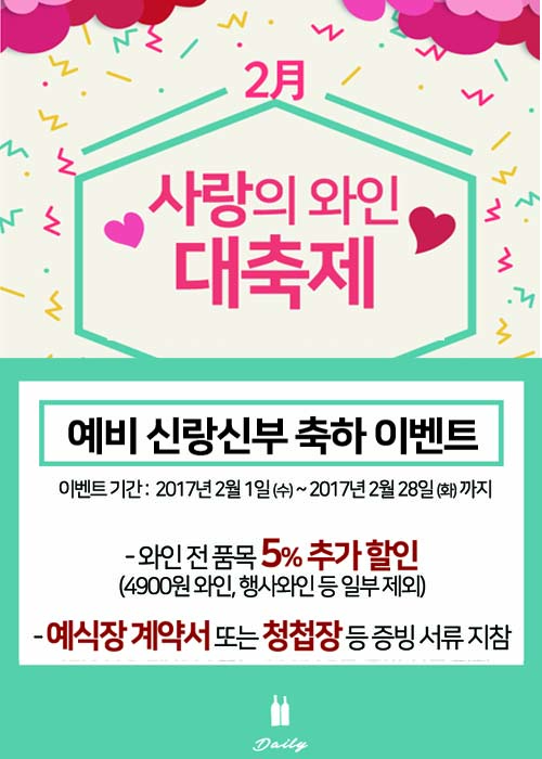 [아시아경제 이주현 기자]데일리와인은 2월 한달 동안 고객감사 ‘사랑의 와인 대축제’를 진행한다고 2일 밝혔다. 데일리와인은 올해 예비 신혼부부를 대상으로 와인 구매 시 예식장 계약서 또는 청첩장 등을 보여주면 추가 할인 혜택을 주는 축하 이벤트를 벌인다. 또, 이들 중 추첨을 통해 독일 슈피겔라우 와인잔(12개) 세트도 선물로 증정한다. 이와 함께 2월 말까지 엘비와인과 와이브라더스, 신인터내셔널과 손잡고 프랑스, 이태리, 스페인, 칠레, 호주 등 8개국 70여 신상품을 권장가 대비 최대 70% 할인 판매하는 알뜰 와인장터도 진행한다. 지난 1월에 진행됐던 첫 번째 장터의 경우 설 명절을 맞아 합리적인 가격으로 알뜰하게 와인선물을 구매하려는 고객들이 몰리면서 3만원 미만 와인을 중심으로 3000병 이상 팔리는 등 큰 호응을 얻었다. 김희성 데일리와인 대표는 “예비 신혼부부들의 새 출발과 행복을 기원하는 이벤트를 마련했다”며 “알뜰 와인장터를 통해 설 연휴 동안 고생한 아내와 엄마에게 사랑을 듬뿍 담은 와인을 선물하시길 권해드리고 싶다”고 말했다.이주현 기자 jhjh13@asiae.co.kr<ⓒ세계를 보는 창 경제를 보는 눈, 아시아경제(www.asiae.co.kr) 무단전재 배포금지>