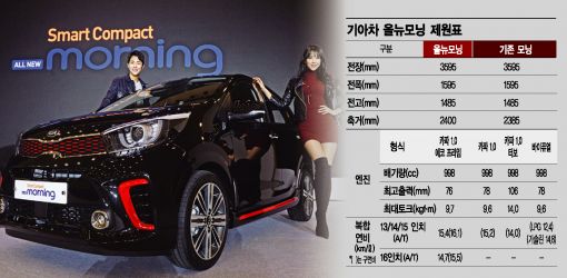 '카파 1.0 에코 프라임 가솔린 엔진'을 탑재해 복합연비가 15.4km/ℓ에 이른다. 또한 '차세대 경차 플랫폼'을 적용해 초기 단계부터 안전성 향상을 염두에 두고 개발했다. 초고장력 강판을 기존 대비 2배인 44%로, 구조용 접착제를 기존 대비 8배 이상 증가한 67m로 각각 확대 적용해 동급 최고 수준의 차체강성을 확보했으며, 차량의 충돌 안전성을 획기적으로 높였다. 그밖에 전방 차량과의 거리를 감지해 충돌 위험 감지시 운전자에게 경보해주는 '전방충돌 경보 시스템', 전방 차량과의 충돌 가능성 인지시 자동으로 브레이크를 작동시키는 '긴급제동 보조 시스템' 등 첨단 안전사양을 탑재해 사고 가능성을 낮췄다. 실내 공간은 더욱 넓어졌다. 기존 대비 15mm 늘어난 2400mm의 휠베이스로 동급 최대 수준이다. 기존 스마트폰 화면을 통해 이용하던 'T 맵'을 차량의 내비게이션 화면에서 이용할 수 있도록 한 '기아 T 맵' 서비스도 신규 탑재했다. 기아차 관계자는 "새롭게 태어난 올 뉴 모닝이 올해 국내 경차 시장을 주도하는 절대강자로 자리매김할 것"이라고 강조했다.이정민 기자 ljm1011@asiae.co.kr<ⓒ세계를 보는 창 경제를 보는 눈, 아시아경제(www.asiae.co.kr) 무단전재 배포금지>