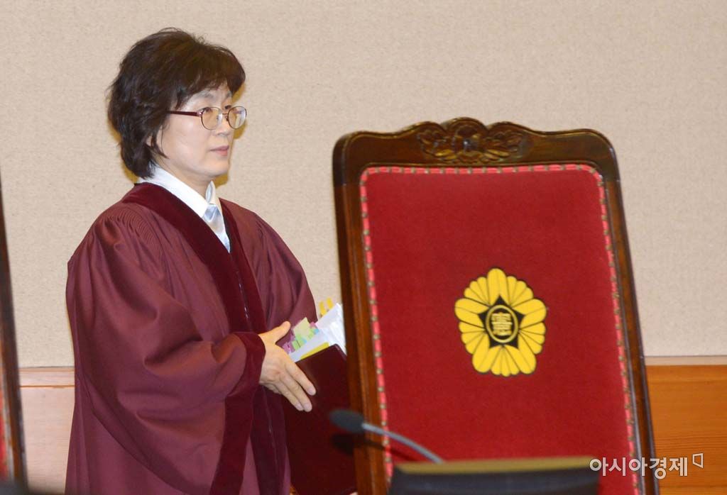 [아시아경제 ] 이정미 헌법재판소장 권한대행이 7일 서울 종로구 헌법재판소에서 열린 박근혜 대통령 탄핵심판 11차 변론기일에 참석하고 있다. <사진공동취재단><ⓒ세계를 보는 창 경제를 보는 눈, 아시아경제(www.asiae.co.kr) 무단전재 배포금지>