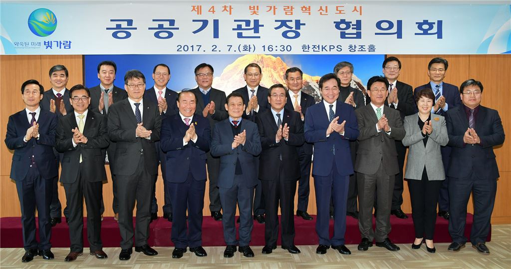 [아시아경제 노해섭 기자]제4차 빛가람혁신도시 공공기관협의회의가 7일 오후 한전KPS㈜ 창조홀에서 개최된 가운데 윤장현 광주광역시장, 이낙연 전남지사, 정의헌 한전KPS㈜ 사장, 장휘국 광주광역시 교육감, 강인규 나주시장, 유대선 국립전파연구원장, 여인홍 한국농수산식품유통공사 사장, 박권식 한국전력공사 본부장, 유상희 한국전력거래소 이사장, 임수경 한전KDN㈜ 사장 등이 기념촬영하고 있다.