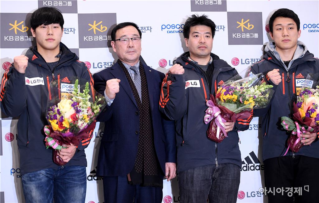 [인천공항=아시아경제 김현민 기자]한국 스켈레톤 간판 윤성빈(왼쪽부터)과 성연택 대한봅슬레이스켈레톤경기연맹 사무처장, 조인호 감독, 김지수가 7일 오스트리아 인스부르크에서 열린 2016~2017 국제봅슬레이스켈레톤연맹(IBSF) 월드컵을 마치고 인천공항을 통해 귀국한 뒤 파이팅을 외치고 있다. 윤성빈은 2016~2017 국제봅슬레이스켈레톤연맹(IBSF) 월드컵 7차 대회 남자 스켈레톤에서 1·2차 시기 합계 1분44초57의 기록하며 동메달을 목에 걸었다. 김현민 기자 kimhyun81@asiae.co.kr<ⓒ세계를 보는 창 경제를 보는 눈, 아시아경제(www.asiae.co.kr) 무단전재 배포금지>