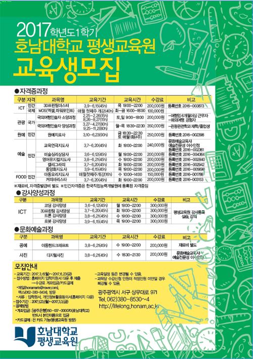 [아시아경제 노해섭 기자]호남대학교 평생교육원(원장 장석주)이 3월 3일까지 ‘2017학년도 1학기 평생교육과정’ 수강생을 모집한다. 모집분야는 국외여행인솔자 등 국가공인자격과정, 원예치료사, 교육연극지도사, 아동요리지도사 등 민간자격과정(한국직업능력개발원등록), 코딩, 드론, 3D프린팅강사양성과정, 공예, 사진 등 문화예술과정으로 20개 교육과정이다. 교육기간은 3월 6일 개강해 6월 23일까지이며 접수방법은 홈페이지에서 입학지원서 다운 후 작성해 제출하면 된다. 신청 및 자세한 문의는 호남대학교 평생교육원(062-380-8530~4)으로 하면 된다. 한편, 호남대학교 평생교육원은 청년실업률 해소와 경력단절여성 재취업, 노후대비 등 취업 시장에서의 경쟁력 있는 인력 배출 및 자유학기제 도입으로 청소년의 진로·직업 선택을 위한 프로그램들의 수요에 발맞춰, 그에 따른 자격과정 및 강사양성과정 등을 운영한다.노해섭 기자 nogary@<ⓒ세계를 보는 창 경제를 보는 눈, 아시아경제(www.asiae.co.kr) 무단전재 배포금지>