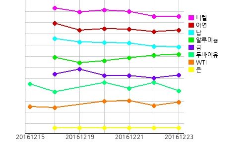 국제 원자재 시장에서 WTI(서부텍사스산원유)의 현물시세가 전일 대비 0.66 달러 오른 배럴당 51.95 달러를 기록했고, 두바이유 현물시세는 전일 대비 1.09 달러 떨어진 배럴당 51.78 달러를 기록했다.금 현물시세는 전일 대비 3.47 달러 오른 온스당 1132.34 달러를 기록했고, 반면 은 현물시세는 전일 대비 0.08 달러 떨어진 온스당 15.73 달러를 기록했다.주요광물시세는 주석이 전일 대비 톤당 199 달러 올라 21239.5 달러를 기록했고 아연, 알루미늄이 상승세를 보이는 반면, 니켈이 전일 대비 톤당 16 달러 떨어져 10567.5 달러를 기록했고 납이 하향세를 보였다.환율