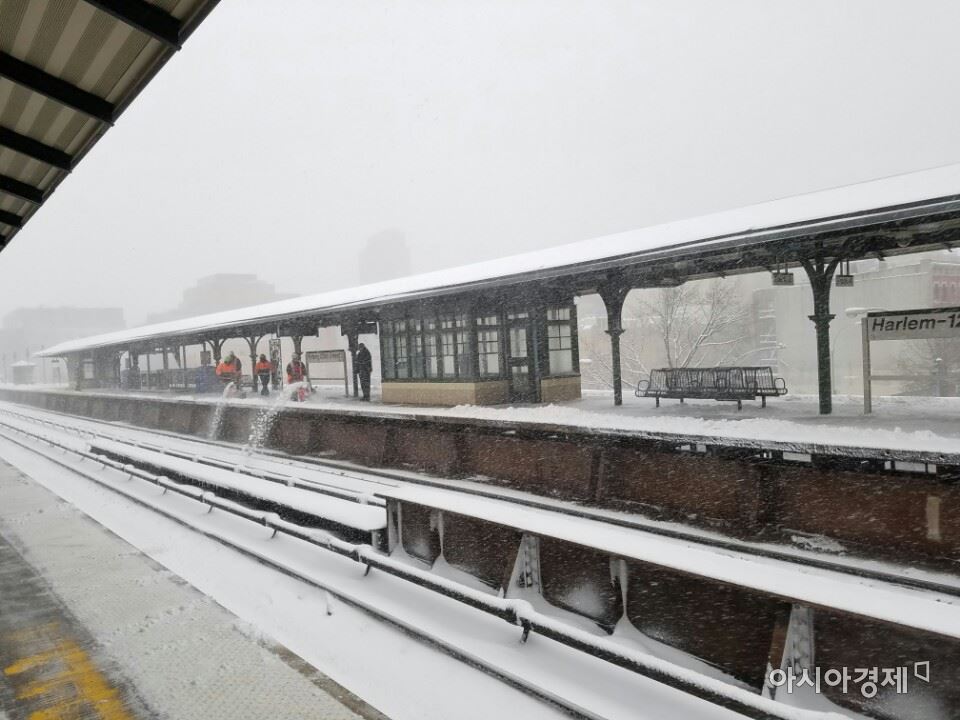 9일(현지시간) 뉴욕에 할렘 125가에 위치한 한 기차역 열차당국 직원들이 눈을 치우고 있다.
