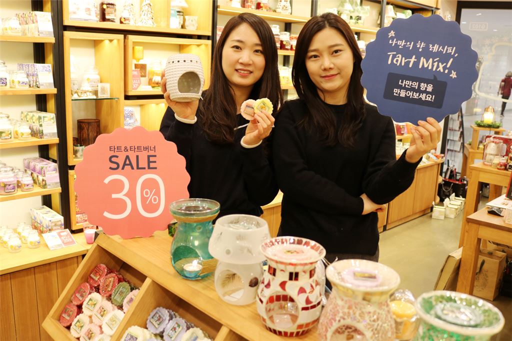 양키캔들 홍보모델들이 타트와 타트버너 상품을 들고 할인행사를 안내하고 있다.<br />