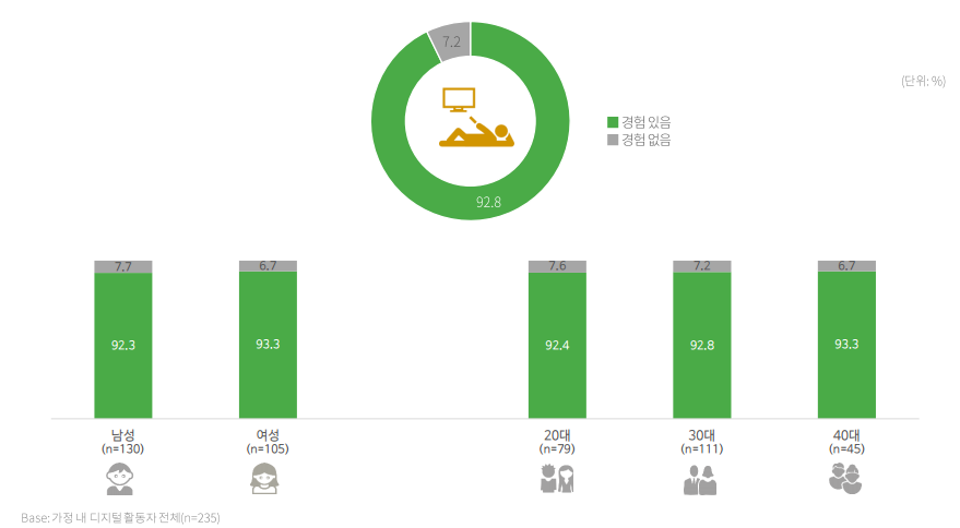 한편 출퇴근이나 등하교 등 이동 시 가장 많이 하는 디지털 활동은 83.6%로 인터넷 뉴스 보기였다. 소셜 미디어(68.1%), 인터넷 검색(59.9%), 모바일 메신저(55.6%), 게임(37.1%), 동영상 시청(37.1%) 순이었다.남성은 인터넷 뉴스, 이북 독서, 통화가 상대적으로 많으며 여성은 소셜 미디어, 모바일 메신저, 인터넷 쇼핑 활동이 두드러졌다. 연령대가 높을수록 인터넷 뉴스, 이북 독서, 전화 통화가 많았고 낮을수록 소셜미디어, 모바일 메신저, 동영상 시청 이용이 많았다.이동시 이용하는 디지털 디바이스는 스마트폰이 99.6%, 태블릿 12.9%, 노트북 7.8% 순이었다. 가정 내에서도 이동시와 마찬가지로 스마트폰(97%)을 주로 이용했다. 노트북이 54.9%, 데스크탑 39.6%로 이동시보다 노트북, PC가 월등이 많이 활용됐다.가정 내에서 디지털 활동은 인터넷 뉴스 보기가 84.3%로 가장 높았다. 이어 인터넷 검색이 81.3%, 인터넷 쇼핑이 75.3%였다.안하늘 기자 ahn708@asiae.co.kr<ⓒ세계를 보는 창 경제를 보는 눈, 아시아경제(www.asiae.co.kr) 무단전재 배포금지>