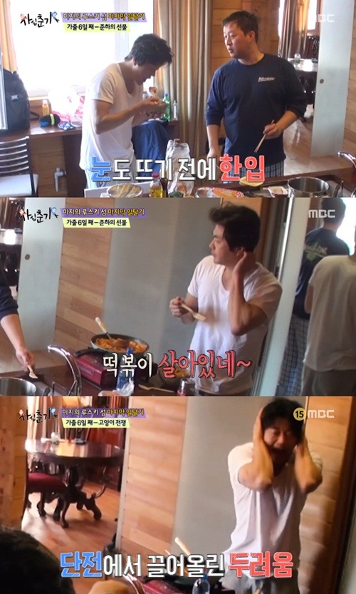 [아시아경제 디지털뉴스본부 송윤정 기자] '사십춘기' 몸짱 배우 권상우가 고양이의 습격에 비명을 질렀다.11일 방송된 MBC '가출선언-사십춘기'에서 '무한도전' 촬영 뒤 권상우 곁으로 돌아온 정준하의 모습이 그려졌다.이날 정준하는 권상우를 위해 아침부터 떡볶이를 준비했다. 권상우는 눈도 제대로 뜨지 못한 상태로 정준하가 만든 떡볶이를 맛본 뒤 "맛있다"며 고마움을 표시했다.식사를 마친 권상우가 외출 준비 도중 숙소에 들어온 고양이를 발견하고 비명을 지르자 정준하는 "불쌍하다. 내보내 주자"며 숙소 문을 열었지만 밖에 있던 다른 고양이까지 들어오게 만들었다. 정준하가 "더 있다"라고 외치자 권상우는 "환장하겠다"며 머리를 쥐어뜯고 소리를 지르며 괴로워했다.이를 본 정준하는 "너도 덩칫값 해라"며 웃음을 터뜨렸고, 권상우는 "고양이가 싫다"며 민망해했다.결국 두 사람은 숙소 직원의 도움을 받아 고양이를 밖으로 내보냈다.디지털뉴스본부 송윤정 기자 singasong@asiae.co.kr<ⓒ세계를 보는 창 경제를 보는 눈, 아시아경제(www.asiae.co.kr) 무단전재 배포금지>