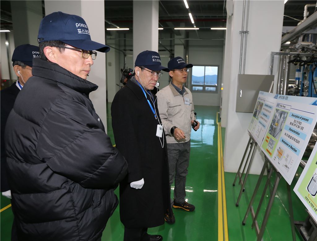 ▲권오준 포스코 회장이 10일 경북 구미에 위치한 포스코ESM 양극재 공장을 찾아 생산현황을 직접 점검하고 있다.