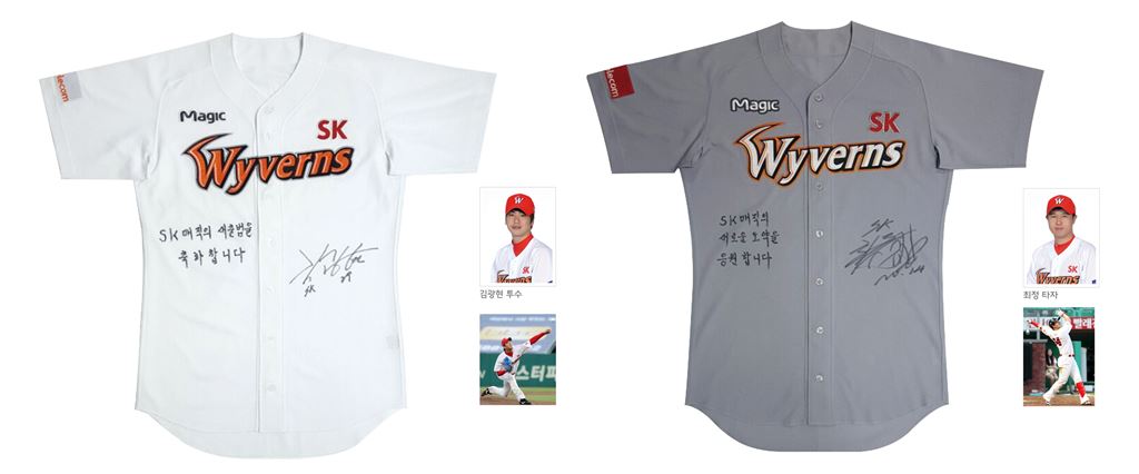 SK와이번스의 간판 선수 김광현 투수(왼쪽)와 최정 타자의 메시지와 사인을 담은 유니폼.<br />