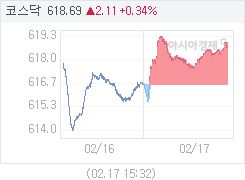 2017년 02월 17일 코스닥 지수는 2.12p (0.34%) 상승한 618.70로 마감했습니다.금일 (2시40분 기준) 코스닥 주요 상승 종목은 코디엠,국일제지,세한엔에스브이이며, 코스닥 주요 하락 종목은 프리젠,삼원테크,엠벤처투자입니다.아경봇 기자 r2@asiae.co.kr<ⓒ세계를 보는 창 경제를 보는 눈, 아시아경제(www.asiae.co.kr) 무단전재 배포금지>
