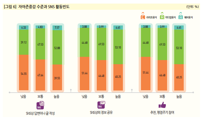 [아시아경제 안하늘 기자] 자아존중감이 높은 사람일수록 소셜네트워크서비스(SNS)를 더 많이 이용하는 것으로 나타났다.18일 정보통신정책연구원(KISDI)은 한국미디어패널조사의 조사를 인용해 이 같은 내용을 담은 '20대의 자아존중감과 SNS 활동 특성' 보고서를 공개했다.한국미디어패널조사는 2010년부터 매년 실시되는 동일 표본 추적 조사로 2015년에는 4305가구 및 9873명 개인을 대상으로 이를 조사했다.자아존중감 점수의 범위는 최소 0점부터 30점까지로 구성되어 있으며, '낮음'(0~14점), '보통'(15~24점), '높음'(25-30점)으로 나누어 분석한다.자아존중감이 '낮음'에 속한 응답자 중에서 SNS 이용여부에 '예'라고 응답한 이들의 비중은 29.9%로 가장 낮았다. 자아존중감이 '보통'인 응답자 중에서는 45.13%, '높음'인 응답자 중에서는 54.29%로 나타났다.만 20-29세 중에서도 자아존중감이 '낮음'으로 분류된 응답자 중 SNS를 이용하고 있다고 한 이들의 비중은 65.63%로 '보통'(76.66%)이나 '높음'(75.9%)에 속한 응답자보다 보다 현저히 낮았다.반면 만 20-29세 중에서 자아존중감이 '높음'에 속한 응답자가 가장 적극적으로 답변이나 글 작성, 정보공유, 추천 및 평점주기와 같은 SNS 활동을 정기적으로 하고 있는 것으로 조사됐다.자아존중감이 '낮음'에 속한 응답자는 SNS 이용은 하고 있으나 라이트 이용자(거의 하지 않음) 비중이 '보통'이나 '높음'에 속한 응답자들보다 높았다. 또 자아존중감이 '낮음'으로 구분된 응답자와 '보통'인 응답자 중에서 조사된 SNS 활동을 거의 매일 하는 헤비 이용자 비중은 큰 차이가 없었다.최지혜 KISDI ICT통계정보연구실 연구원은 "자아존중감이 높은 20대는 자신의 생각이나 의견을 적극적으로 표현하거나 다른 이들과 소통하고자 하는 성향을 갖고 있으며, 이러한 성향이 활발한 SNS 활동에서도 나타나고 있는 것으로 해석된다"고 말했다.사진=KISDI