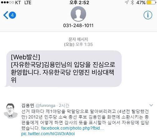 [아시아경제 디지털뉴스본부 김윤주 기자] ‘나는 꼼수다’로 이름을 알린 시사평론가 김용민이 자유한국당에 입당했다.김용민은 17일 자신의 SNS에 “자유당에 입당했다”며 “선거 때마다 제1야당을 막말당으로 말아버리려고 탈당한 지 4년이 지났음에도 2012년 민주당 소속 총선 후보 김용민을 화면에 등장시키는 종편들에 감사의 뜻을 표하는 의미에서 입당했다”고 전했다.이어 “박근혜 동지, 김진태 동지, 이노근 동지. 함께 태극기가 넘실대는 세상을 건설하자”고 덧붙였다. 이와 함께 자유한국당으로부터 받은 문자메시지 캡처 화면을 첨부했다. 메시지에는 김용민의 입당을 진심으로 환영한다는 내용이 담겨 있다.김용민은 2012년 제19대 국회의원 선거에서 서울 노원갑 민주통합당 후보로 출마했다. 그는 당시 ‘나는 꼼수다’ 공동 진행자로 화제를 모았지만, 막말 논란과 기독교 비판 발언이 문제되며 낙선했고 이듬해에 민주당을 탈당했다.디지털뉴스본부 김윤주 기자 joo0416@asiae.co.kr<ⓒ세계를 보는 창 경제를 보는 눈, 아시아경제(www.asiae.co.kr) 무단전재 배포금지>