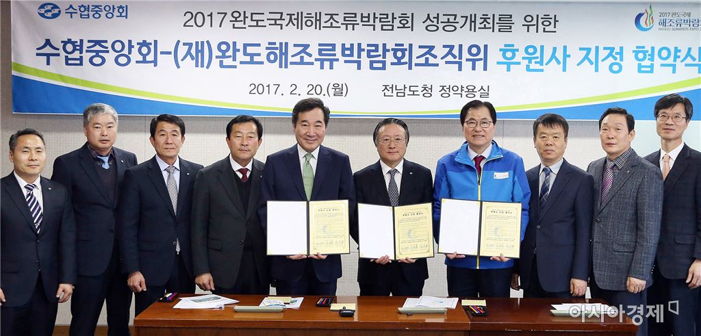 [아시아경제 노해섭 기자]이낙연 전남지사(왼쪽 다섯번째부터), 김임권 수협중앙회장, 신우철 완도군수가 20일 도청 서재필실에서 ‘2017 완도국제해조류박람회’ 후원사 협약을 하고 있다. 주요 내용은 수협중앙회가 박람회 공식 엠블럼과 로고 사용권을 갖고, 입장권(20,000매) 사전구매와 수협 네트워크를 이용한 홍보 등이다.사진제공=전남도 <ⓒ세계를 보는 창 경제를 보는 눈, 아시아경제(www.asiae.co.kr) 무단전재 배포금지>
