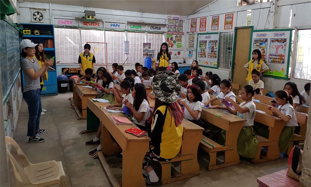 글로벌 봉사단 소속 학생이 필리핀 만다우에시에서 한국 문화교류를 위한 봉사활동을 벌이고 있다. 한밭대 제공