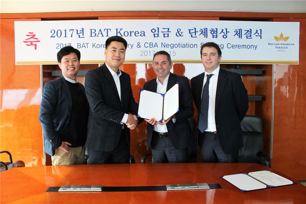 (왼쪽부터) 이경민 노조 부위원장, 정필운 노조 위원장, BAT 코리아 토니 헤이워드 사장, 해미쉬 노리 전무가 노사 협상 타결뒤 기념촬영을 하고 있다.