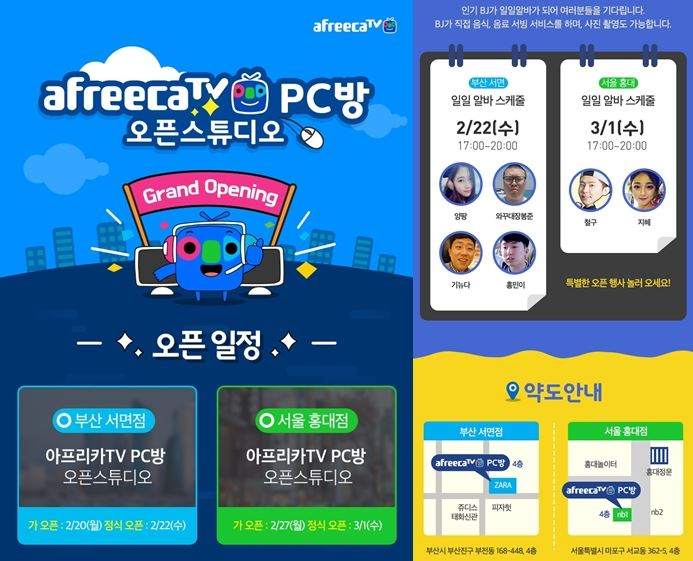 '놀이터' 콘셉트로 24시간 운영…신입BJ·예비 BJ 모두 체험 가능e스포츠존 마련해 6대6 팀 대결도 가능부산 160여대, 홍대 120여대 고사양 PC 갖춘 'PC방'도 운영