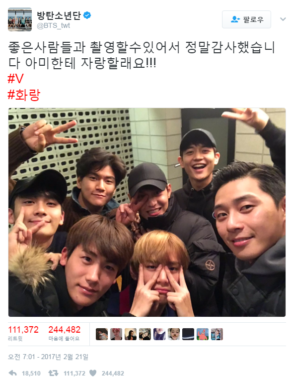 [아시아경제 디지털뉴스본부 이은혜 기자] ‘화랑’의 막내 김태형이 드라마를 마친 소감을 전했다.KBS 월화드라마 ‘화랑’이 막을 내렸다. 이에 배우이자 그룹 방탄소년단의 멤버인 김태형(뷔)은 21일 SNS를 통해 팬들에게 감사를 표시했다. 그는 “좋은 사람들과 촬영할 수 있어서 정말 감사했습니다. 아미(방탄소년단 팬클럽)한테 자랑할래요!”라며 ‘화랑’의 남배우들과 함께 찍은 셀카를 게시했다. 사진 속에는 김태형을 비롯해 배우 조윤우, 박형식, 도지한, 김태형, 최민호는 물론, ‘단세’ 역으로 존재감을 과시한 배우 김현준의 모습도 눈에 띈다.2013년 방탄소년단으로 데뷔한 김태형은 KBS 월화드라마 ‘화랑’을 통해 연기자로서 첫 발을 내딛었으며, 막내 화랑 ‘한성’ 역을 자신만의 색깔로 소화했다는 평을 받았다. KBS 월화드라마 ‘화랑’은 1500년 전 신라 수도 서라벌을 누비던 화랑들의 열정과 사랑, 성장을 그린 청춘 드라마다. 지난해 12월19일 첫 방송됐으며, 21일 방송된 20회를 끝으로 막을 내렸다. 디지털뉴스본부 이은혜 기자 leh92@asiae.co.kr<ⓒ세계를 보는 창 경제를 보는 눈, 아시아경제(www.asiae.co.kr) 무단전재 배포금지>
