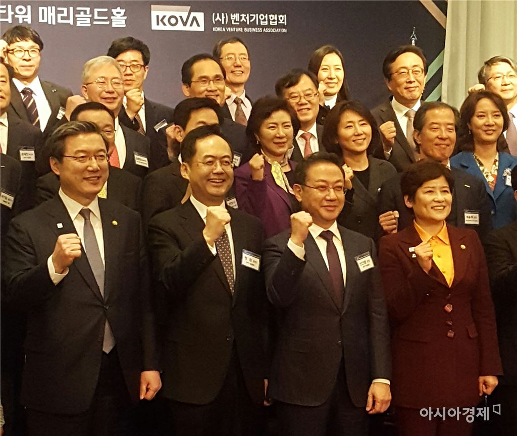 [아시아경제 정동훈 기자] "세계최고의 벤처생태계를 구축하고 글로벌벤처 도약을 위한 성장사다리를 만드는데 협회 역량을 집중하겠습니다."22일 안건준 벤처기업협회 신임회장은 취임사에서 이같이 말했다. 안 회장은 연구개발(R&D)과 혁신기술이 제대로 평가받을 수 있는 공정경쟁의 기반 구축도 목표로 내걸었다. 활발한 정책 제안과 더불어 벤처기업계 성장을 도모해 한국경제에 새로운 활력이 되겠다는 청사진이다. 이날 벤처기업협회는 서울 서초 양재동엘타워에서 '2017년 제 22차 정기총회 및 회장 이·취임식'을 열었다. 이날 이취임식에는 강은희 여성가족부 장관, 주영섭 중소기업청장, 김문겸 중소기업옴부즈만, 박성택 중소기업중앙회 회장, 이용성 벤처캐피탈협회 회장 등 정계와 중소기업계 주요인사가 참석했다.정준 전 벤처기업협회 회장은 이임사를 통해 "한국 벤처 기업계는 우리 경제의 새로운 축으로 양적·질적으로 성장했다"며 "앞으로도 벤처기업 발전의 중심이 될 협회에 관심을 가지고 돕도록 하겠다"고 밝혔다.주영섭 중기청장은 ""4차 산업혁명의 시기에 기술혁신과 글로벌 진출의 선두에 선 벤처기업이 우리경제의 성장동력이 될 것이다"며 "정부도 벤처기업특별법 개정 등 벤처기업계 현안을 위해 노력하겠다"라고 말했다.22일 벤처기업협회 제 8·9대 회장 이·취임식에서 주요 참석자들이 기념촬영을 하고 있다. 사진 앞줄부터 주영섭 중소기업청장, 정준 전 벤처기업협회 회장, 안건준 벤처기업협회 신임회장, 강은희 여성가족부 장관.