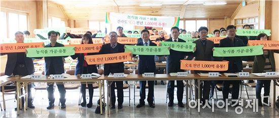 " 23일 선도농업인 등과 워크숍 갖고 매출 확대 방안 토론" [아시아경제 노해섭 기자]전라남도는 23일 보성우리원에서 가공?유통 분야 선도농업인, 농산물 가공 우수 업체, 시군 유통 담당 관계자들이 참석한 가운데 농식품 가공·유통 활성화 워크숍과 다짐대회를 개최했다.이날 행사는 한때 2차 산업이 발달한 공업도시를 선망하는 시대가 있었다면, 앞으로는 자연과 환경, 농업이 살아 숨쉬는 전남을 동경하는 시대가 온다는 신념을 갖고 올 한 해 동안 시군별로 1천억 농산물 유통 달성을 다짐하는 장으로 치러졌다.워크숍에서는 또 시군별로 농산물 판매 시책 추진 상황 및 우수사례를 발표하고, 대형 유통업체에서 백화점 식품 및 유통 트렌드, 온라인 동향 및 판매전략을 설명했다. 또 가공·유통 분야 선도 농업인들이 대기업 납품 및 입점 성공 노하우 등을 소개했다.특히 새로운 유통 경로 확대 방안 및 판매 전략 정보 교류로 농가 소득을 증대하기 위한 민관 공동 시군별 네트워크 구축과 농식품 가공·유통 분야 활성화를 통한 매출 확대 방안을 토론했다.김갑섭 전라남도 행정부지사는 워크숍에서 “세계 트렌드와 소비자 욕구에 맞춰 경쟁력을 높이려면 고품질의 안전한 농산물을 공급해 신뢰를 얻어야 하고, 브랜드가치를 높여 소득을 창출토록 해야 한다”며 “친환경 농업으로 명성을 지켜온 전남답게 식품 가공산업을 키우고 고부가가치화를 추진해 농가의 소득을 높여 나가자”고 당부했다.전라남도는 이날 워크숍에서 농식품 가공·유통 활성화를 위한 다양한 의견을 수렴해 농식품 유통혁신 5개년 계획 등 중장기적 계획을 수립할 예정이다. 노해섭 기자 nogary@<ⓒ세계를 보는 창 경제를 보는 눈, 아시아경제(www.asiae.co.kr) 무단전재 배포금지>