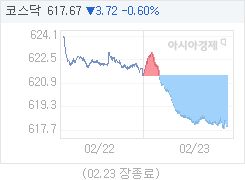 2017년 02월 23일 코스닥 지수는 3.72p (0.60%) 하락한 617.67로 마감했습니다.금일 (3시10분 기준) 코스닥 주요 상승 종목은 아리온,에프알텍,피씨엘이며, 코스닥 주요 하락 종목은 프리젠,케이엔씨글로벌,코아크로스입니다.아경봇 기자 r2@asiae.co.kr<ⓒ세계를 보는 창 경제를 보는 눈, 아시아경제(www.asiae.co.kr) 무단전재 배포금지>