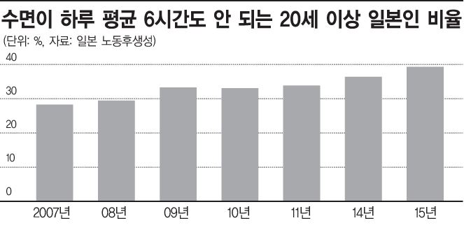 [아시아경제 이진수 기자] 근로자들의 수면부족이 세계 3대 경제국인 일본에 막대한 손실을 안겨주는 것으로 나타났다.지난해 10월 발간된 일본 정부의 '과로사 백서'에 따르면 정규직 근로자 중 절반 정도가 수면을 충분히 취하지 못한다. 지나친 초과근무 탓이다.도쿄(東京) 소재 다이이치(第一)생명경제연구소의 사쿠야마 준코(柵山順子) 이코노미스트는 최근 블룸버그통신과 가진 전화통화에서 일본 근로자들의 수면부족이 "지나친 초과근무 등 혹독한 직장문화 탓"이라며 "근로자들의 장시간 근무는 수면부족과 생산성 저하로 이어지고 있다"고 지적했다.문제가 심각해지자 몇몇 기업은 '최단 휴식시간', 다시 말해 퇴근 후 다음날 출근까지 일정 시간 휴식을 보장했다. 스미토모미쓰이(三井住友)신탁은행은 9시간의 최단 휴식 적용 대상을 지난해 12월 전직원으로 확대했다. 생활용품 제조업체 유니참은 8시간의 최단 휴식을 보장하고 저녁 10시 이후 직장에 머무는 것을 금했다.유럽연합(EU)의 법정 하루 최단 휴식은 11시간이다. 그러나 일본에는 이를 정한 법이 아직 없다. 과로사 백서에 따르면 조사 대상 1700개 기업 가운데 최단 휴식시간을 보장한 곳은 겨우 2%다.