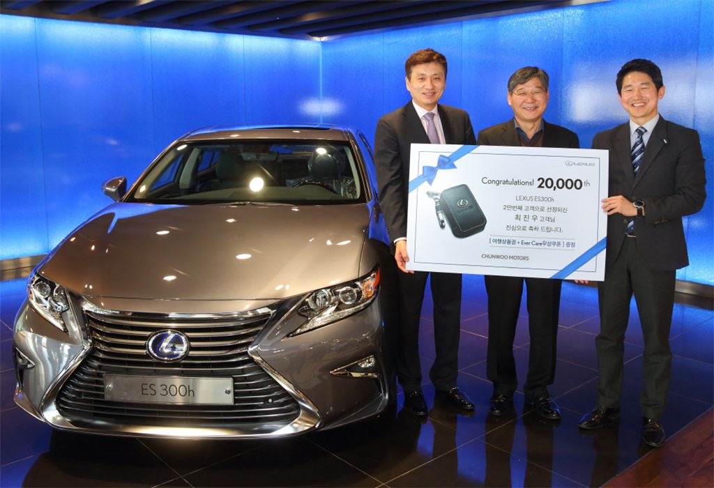 렉서스는 ES300h의 2만 번째 고객 탄생을 기념해 깜짝 이벤트를 진행했다고 28일 밝혔다. 렉서스는 '2만번째 고객' 행운의 주인공인 최진우 씨에게 해외 여행 상품권과 무상 차량 관리 쿠폰 등을 증정했다. <br /> <br />