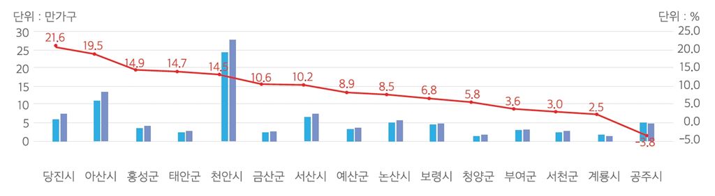 2010년~2015년 충남도 내 시·군별 총 가구 수 및 증감율 현황 그래프. 충남도 제공
