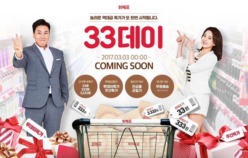 [아시아경제 김유리 기자] 위메프는 오는 3일 자정부터 24시간 동안 900여개의 상품을 33원, 333원, 3333원 등 초특가에 판매하는 '위메프 33데이'를 진행한다고 2일 밝혔다.이번 위메프 33데이에는 매 시간 정각마다 33원의 파격적인 가격에 ▲해피머니 1000원 상품권 ▲아디다스 코트밴티지 ▲제주렌터카 24시간 이용권 ▲한돈 삼겹살 400g ▲호텔숙박권 ▲한샘 베이직 2단 식기건조기 등을 선보인다. 333원에 ▲여의도 63아쿠아플라넷 입장권 ▲키친아트 핸디 스팀다리미 등을, 3333원에 ▲라자가구 일체형침대 ▲포시즌 진공청소기 ▲제주항공 편도권 등을 한정수량 판매한다. 이 외에도 잇츠유 매트리스SS 등을 3만3000원에 젠티스 패밀리침대Q와 SS매트포함 등을 33만3000원이라는 파격적인 가격으로 한정수량 판매한다. 시간 별 오픈되는 특가 상품은 당일 위메프 33데이 페이지에서 확인할 수 있다.'투데이특가'와 '주간특가'에서도 총 500여개의 상품을 할인된 가격과 알찬 구성으로 균일가에 선보인다.그 외에도 즐겁고 다채로운 쇼핑을 위해 위메프 내 롯데백화점 카테고리 일부 제품에 한해 1만5000원 이상 구매 시 25% 할인쿠폰을 3월3일 자정부터 24시간동안 추가 제공한다(최대 2만원 할인). 대표 상품으로는 케네스레이디의 S/S시즌 아이템과 탑텐의 맨투맨, 항공점퍼, 신학기 가방, 샌들 등 봄 시즌 특가상품을 9900원부터 판매한다. 맨잇슈트의 정장세트는 할인쿠폰 적용 시 2만원대로 구입 가능하고, 마크모크의 샌들, 로퍼, 펌프스 등도 3만5900원부터다. 이 외에도 SOUP, 라인, 비지트인뉴욕, 어반코드, 더블엠, 모그어스, 소보제화 등 다양한 브랜드의 상품을 저렴한 가격에 한정수량 판매한다.이진원 위메프 상품사업본부 본부장은 "33데이가 종료된 뒤에도 이틀 동안 기존 투데이특가와 주간특가 등을 통해 33데이 못지 않은 파격가로 지속적인 특가행진을 이어갈 예정"이라며 "본격적인 봄을 맞아 다양한 봄 신상 아이템을 초특가에 준비한 만큼 봄맞이 쇼핑을 계획중인 고객이라면 위메프 33데이에서 즐겁고 합리적인 쇼핑 하시기 바란다"고 말했다.김유리 기자 yr61@asiae.co.kr<ⓒ세계를 보는 창 경제를 보는 눈, 아시아경제(www.asiae.co.kr) 무단전재 배포금지>