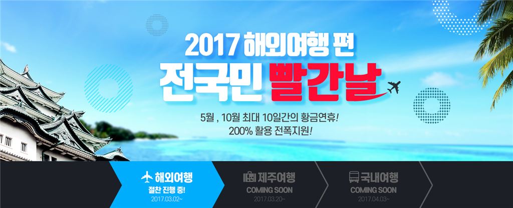 황금연휴 기간 일본, 동남아, 미국, 유럽 등 다양한 지역 여행 상품 판매최장 10일 황금연휴 특가 기획상품 총 260여종 소개, '여행 코칭 서비스'도[아시아경제 김유리 기자] 티켓몬스터가 운영하는 소셜커머스 티몬은 '전국민 빨간날' 기획전을 열고 5월과 10월 황금연휴 기간 해외, 국내 여행 상품의 특가 판매를 시작한다고 2일 밝혔다.이번 기획전은 아직 황금연휴기간 계획을 하지 못한 고객을 위해 일본, 중국, 동남아, 미주, 유럽, 대양주까지 다양한 여행 상품을 제공한다. 기획전 상품들은 근로자의 날과 석가탄신일, 어린이날이 있는 5월의 첫 주와 추석과 한글날이 있는 10월 연휴에 출발이 포함된 상품이다. 이날부터 진행되는 기획전에는 총 110여종의 해외여행 상품, 50여종의 제주도 상품, 100여종의 국내와 숙박 상품 등 총 260여 종의 여행상품이 판매된다.해외여행편 기획전에는 ▲ TV프로그램에 나와 인기가 높은 중국 장가계 패키지 ▲ 5성급 호텔인 괌의 두짓타이 3박 5일 패키지 ▲ 폼페이 유적지와 나폴리 항구 등 남부까지 일정까지 포함된 이태리 9일 일주 상품 ▲ 뉴욕, 워싱턴 DC 등의 미동부 도시와 캐나다 퀘백을 여행하는 패키지 상품 등 고객에 취향에 맞는 다양한 여행 상품이 준비돼 있다.기획전과 함께 일자별 소량의 옵션만으로 진행하는 황금연휴 한정 상품도 진행된다. 3월2일 황금연휴 한정상품은 ▲ 태국과 방콕, 파타야 3박 5일 패키지 ▲ 중국 장사·장가계 5일·6일 황금연휴출발 패키지 ▲사이판 켄싱턴 4박5일 패키지다.티몬은 기획전 기간 동안 고객이 원하는 일정에 구입하고 싶은 상품이 없을 경우 문의를 남기면 각 지역의 여행 MD들이 원하는 일정이 포함된 상품을 메일이나 SNS로 추천해주는 '여행코칭서비스'를 운영할 예정이다.이강준 티켓몬스터 멀티비즈그룹장은 "5월과 10월에 최대 10일의 황금연휴를 즐길 수 있는 기간이지만 여행 상품을 찾는 것이 쉽지 않다. 티몬은 아직 여행을 계획하지 못하는 고객들이 편리하게 여행을 떠날 수 있도록 이번 기획전을 준비했다"며 "260여종의 기획전 특가 상품과 한정 상품을 통해 일상에서 벗어난 휴식을 즐기기 바란다"고 말했다.김유리 기자 yr61@asiae.co.kr<ⓒ세계를 보는 창 경제를 보는 눈, 아시아경제(www.asiae.co.kr) 무단전재 배포금지>