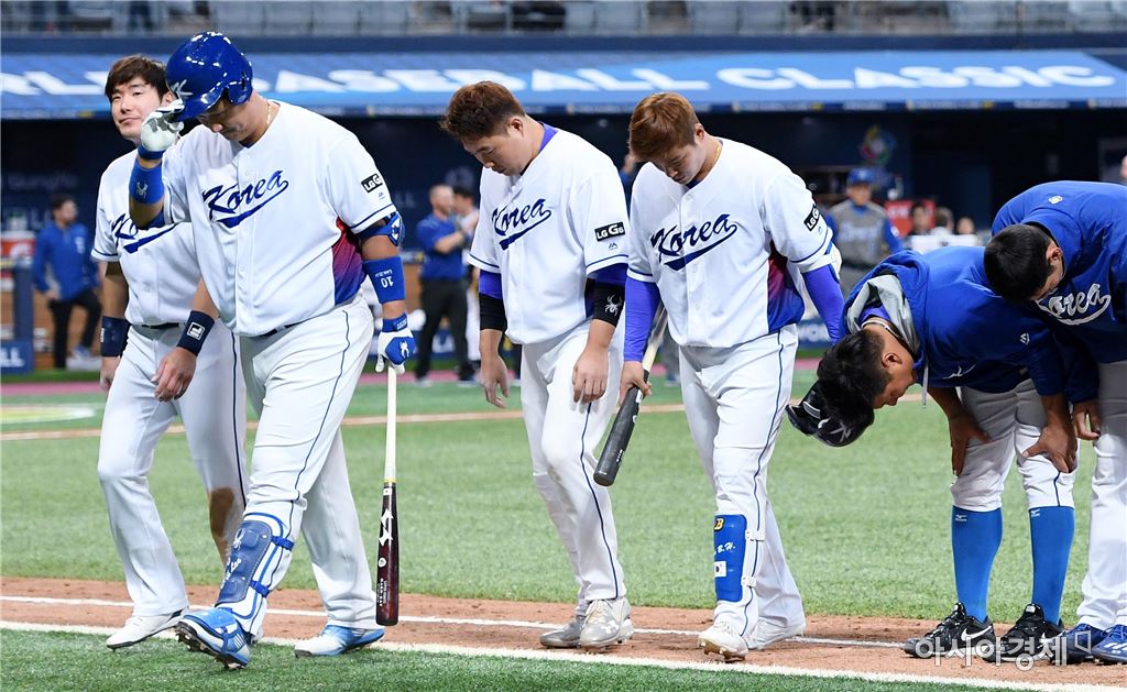 [아시아경제 김현민 기자]6일 서울 고척돔에서 열린 2017 월드베이스볼클래식(WBC) 우리 대표팀과 이스라엘의 1라운드 1차전, 1-2로 진 대표팀 선수들이 관중들에게 머리 숙여 인사하고 있다.김현민 기자 kimhyun81@asiae.co.kr<ⓒ세계를 보는 창 경제를 보는 눈, 아시아경제(www.asiae.co.kr) 무단전재 배포금지>