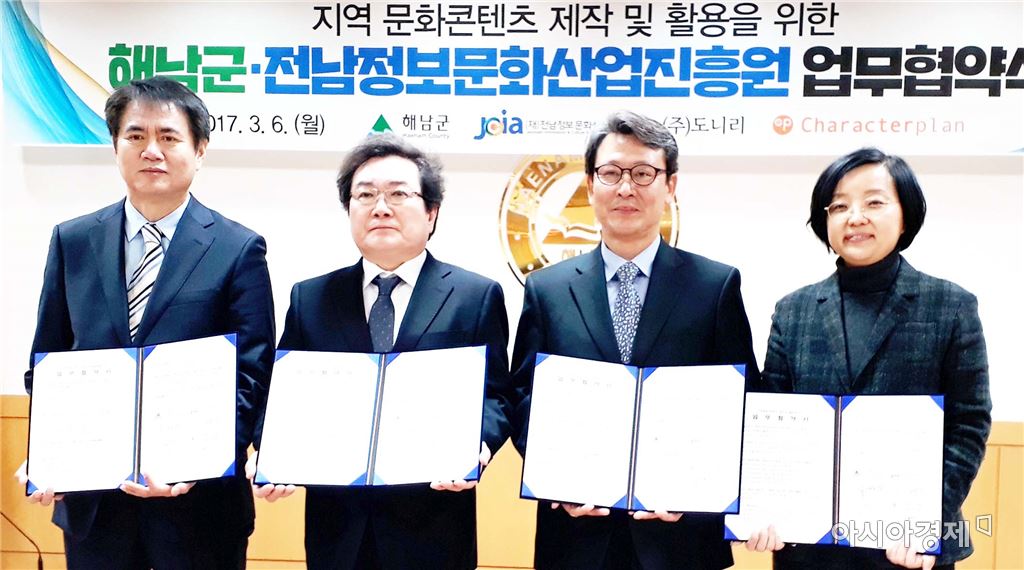 ㈜도니리 이동기 대표, 유영걸 해남군수 권한대행, (재)전남정보문화산업진흥원 이병욱 단장, , ㈜캐릭터플랜 양지혜 대표(왼쪽부터)가 기념촬영을 하고있다.